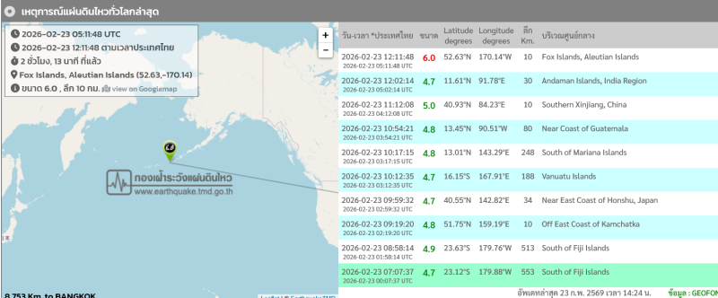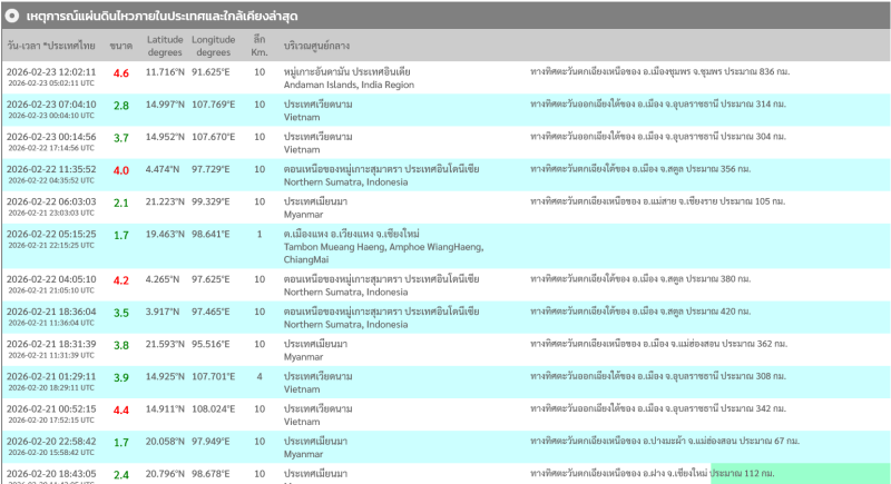 23 ก.พ. 69 เหตุการณ์แผ่นดินไหวภายในประเทศและใกล้เคียงล่าสุด